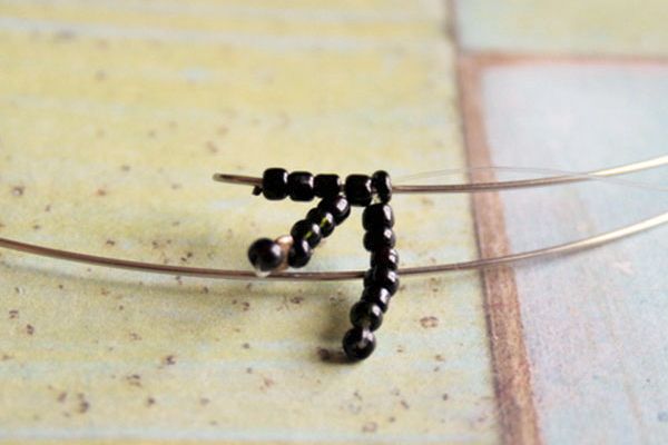 6. Доходим до мемори-проволоки и надеваем ещё одну бисеринку, в неё продеваем длинный хвост лески и снова набираем бисер, нужно вам количество, далее снова отправляем леску в обратном направлении.
