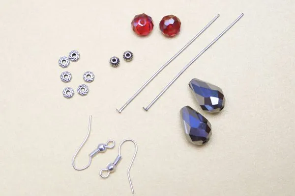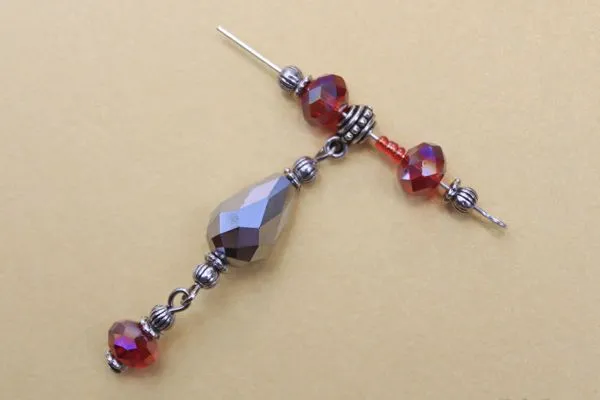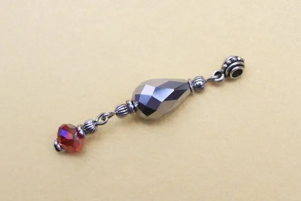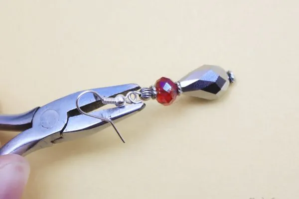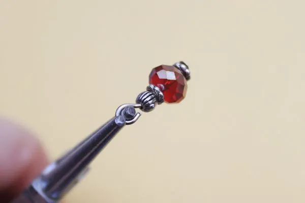 4. Звено с каплей присоединяем к бейлу, зажимаем до конца петлю. Далее нужно нанизать на пин с кольцом бейл, по бокам которого находятся рондели, плоские металлические, а затем круглые металлические бусины.