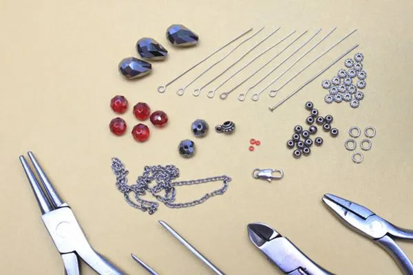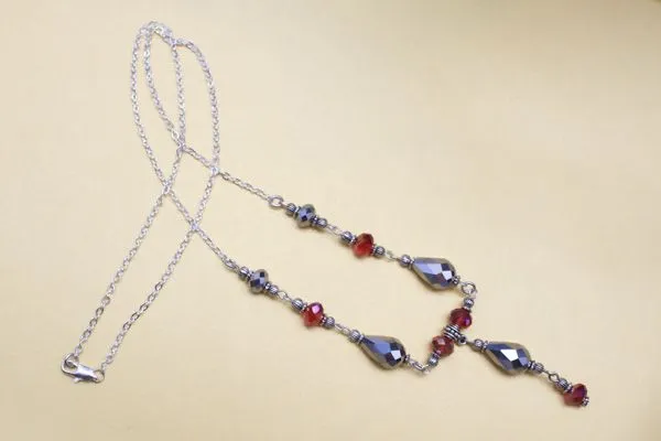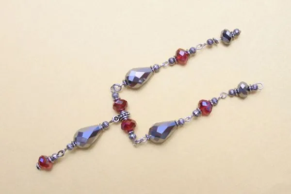 7. Каждую из боковых частей колье при помощи соединительных колечек присоединяем к петлям горизонтальной штанги концом, на котором расположены бусины-капли.