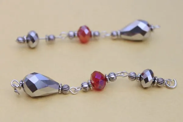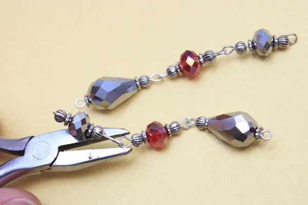 6. Соединяем боковые звенья в таком порядке: с чёрной бусиной-каплей – с цветным ронделем – с чёрным ронделем. Зажимаем петли.