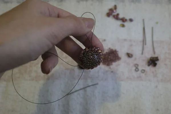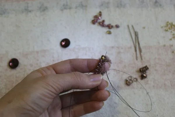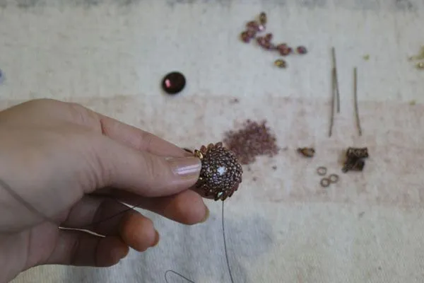 12. Поэтому количество бисеринок в ряду нужно будет уменьшить, пока плетение полностью не закроет внутреннюю сторону кабошона.