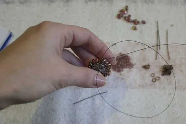 2. Бисеринки должны быть в одном направлении. Замыкаем их в круг и завязываем двойной узел, не сильно крепко.