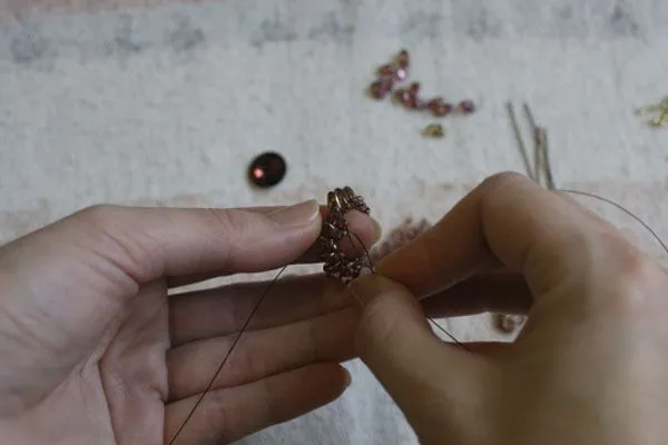 17. Оплетение закончили. Рабочую нить мы продеваем от середины плетения к краю нашего кабошону, к месту начала плетения в первом ряду.