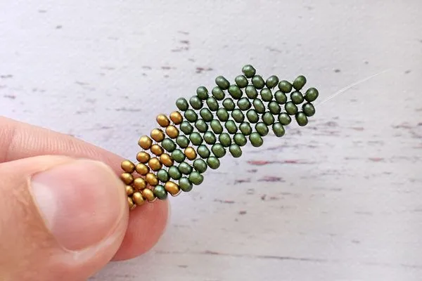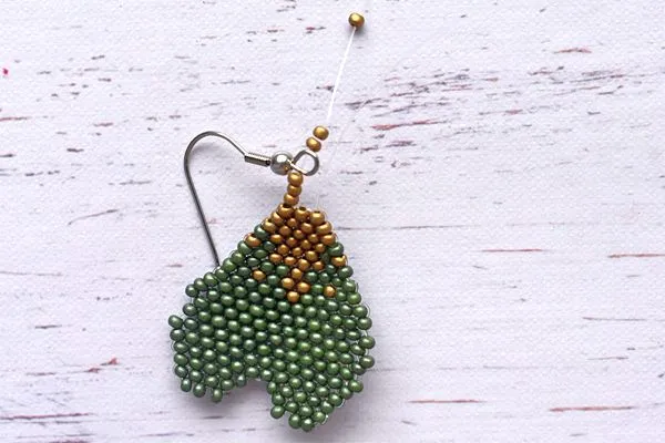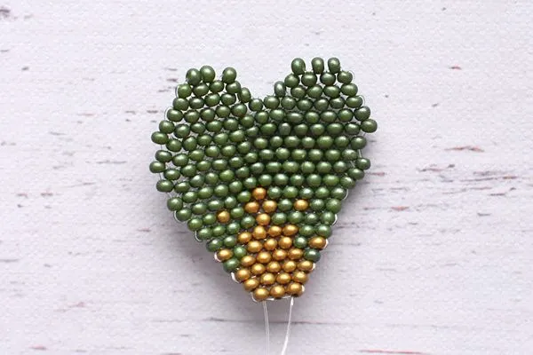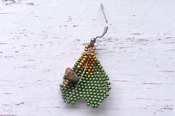 16. Другим концом лески проходим параллельно. Затягиваем, расправляем камушки и с изнанки делаем узелок и убираем лишнюю леску.