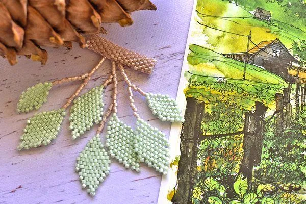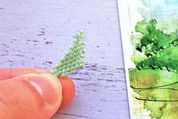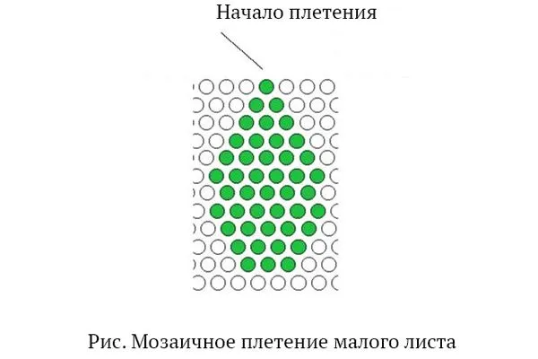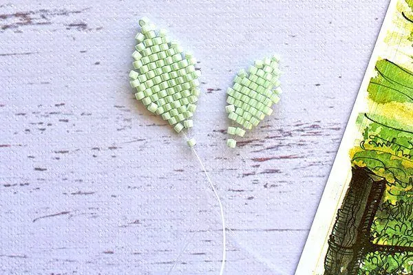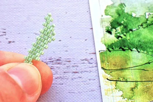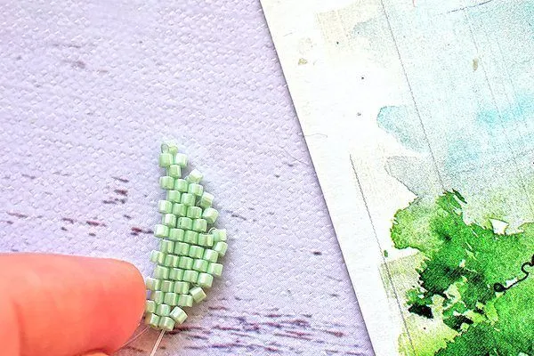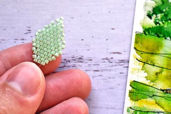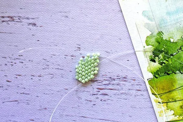 1. Приступим к заготовкам листочков. Листочки плетем в технике мозаичного плетения из светло-зеленого бисера.