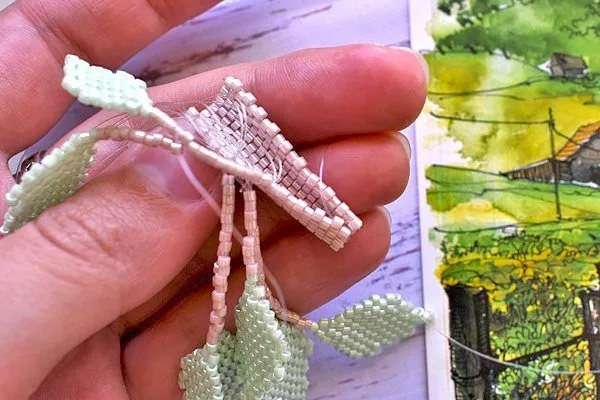 14. Второй лист подготавливаем так же. Соединяем 2 веточки вместе. На концы лески веточек нанизываем необходимое количество бежевого бисера.