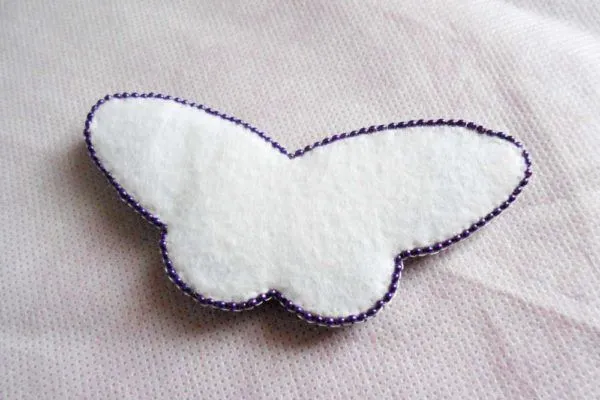 14. Аккуратно вырезаем бабочку, отступая от стежков примерно на 1-2 мм. Вырезаем еще один трафарет из фетра для спинки. Если решите делать брошку или кулон, лучше использовать кожу.