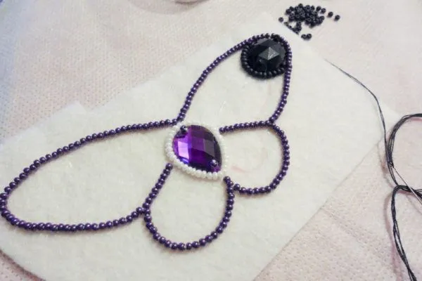 9. Обшиваем темно-фиолетовым край бабочки таким же способом, как и обшивали страз.