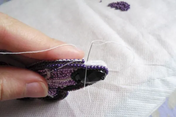 15. Пришиваем бабочку к спинке. Начинаем обрабатывать края вышивки бисером.