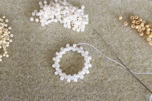 1. Нанизываем на нить 32 бисерины 11/0 и замыкаем круг. Закрепляем нить.