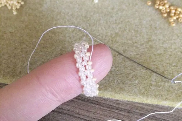 16. Выводим нить из средней 15/0 и набираем ещё 5 пятнашек. Проходим в соседнюю среднюю 15/0, снова по кругу и снова затягиваем.