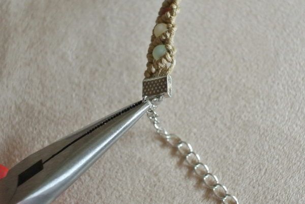 10. Оформляем застежку: с помощью колечка крепим с одной стороны браслета на зажим-концевик – застежку-лобстер, с другой – цепочку.
