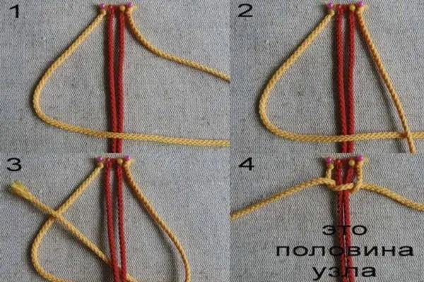 10. Закругляем браслет, как показано на фото, и плетем застежку из четырех квадратных узлов. Основой здесь служат обе нити браслета, рабочей нитью – отдельная нить 20 см.