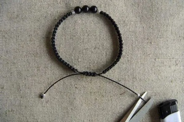 13. Оформляем концы браслета: надеваем металлические бусины-шарики, обрезаем излишки нитей, оставив 5-6 см, подпаливаем концы.