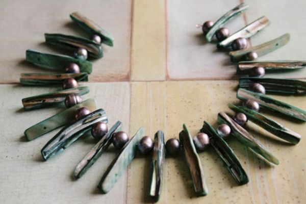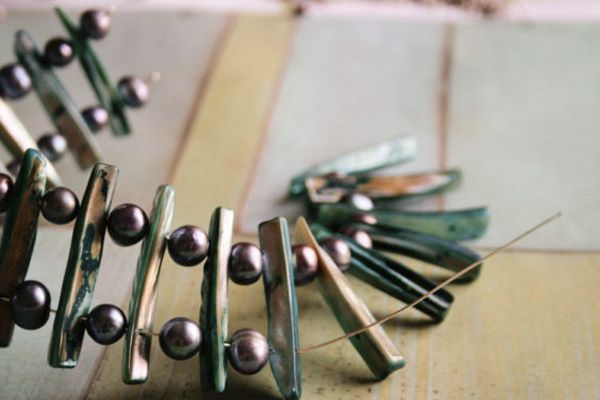 6. Используем нижнее (второе) отверстие перламутровых бусин. Мемори-проволка будет гнуться, это не страшно. Поэтому мы берем проволоку толщиной не более 0.7 мм, с более толстой проволокой мы не сможем сделать второй ряд. Доходим до конца и делаем петлю.