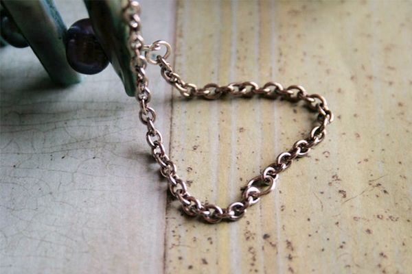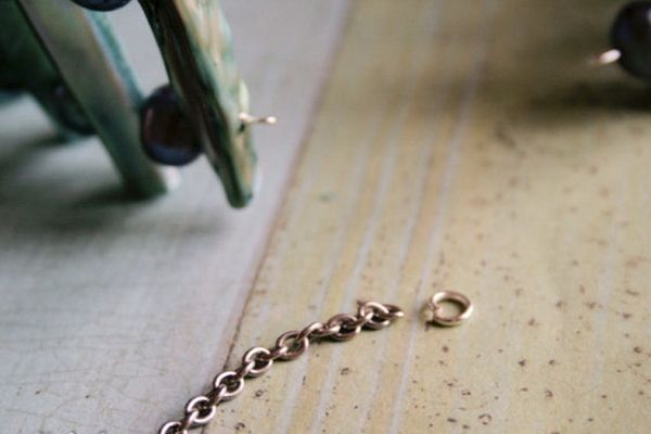 7. Ставим цепь. Отрезаем цепь длиной 4 см – 4 шт. прикрепляем к каждому из колечек, прикрепляем с помощью соединительного кольца.