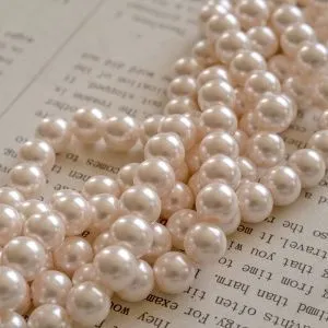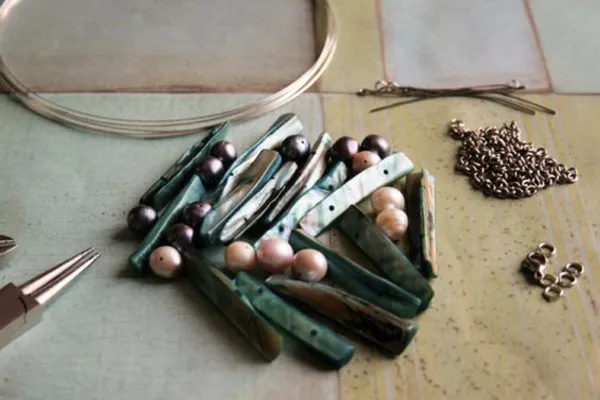 4. Далее начинаем нанизывать бусинки: 1 жемчужная бусинка, 1 перламутровая бусина, 1 жемчужная и т.д. Доходим до конца проволоки и делаем петлю.