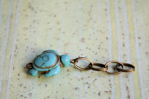 6. Для этого можно разжать либо звено цепи, либо петельку, а потом зажать. Берем следующую черепаху и пин, и снова подрезаем пин, делаем колечки и присоединяем её к цепи. Обратите внимание, что все черепахи идут в одном направлении