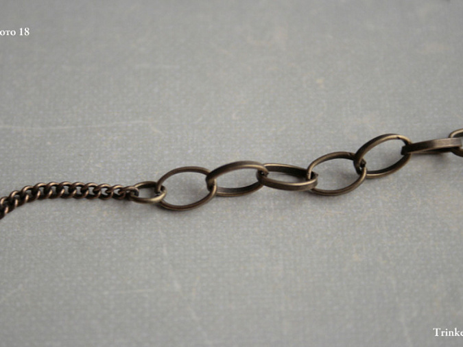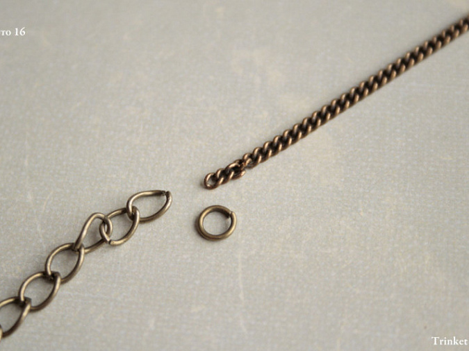 15. Соединим цепь с размером звена 4х6мм с цепью 1х1 мм с помощью соединительного колечка. То же самое сделаем с другой стороны.