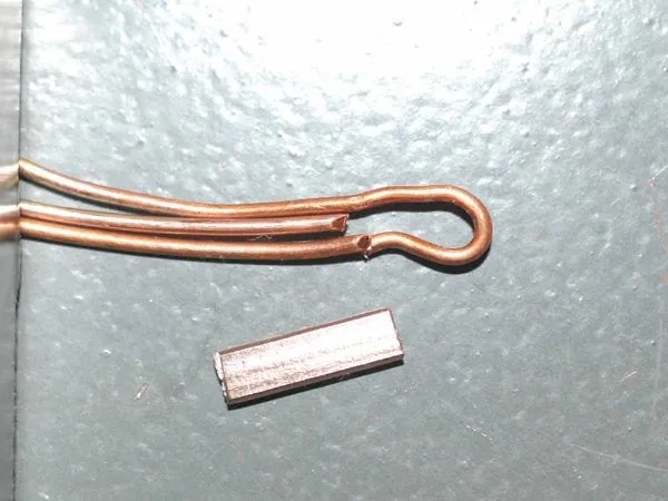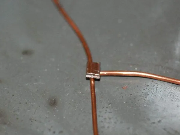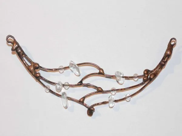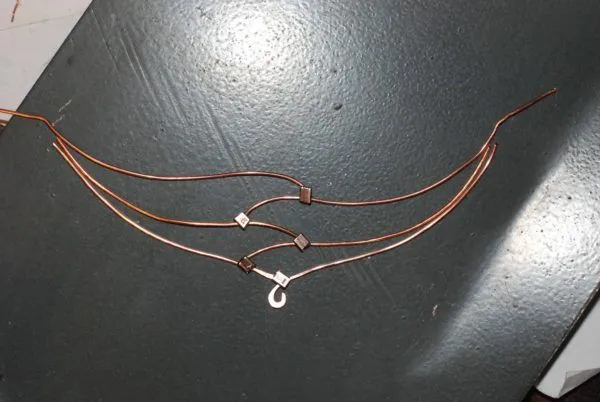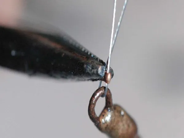 14. На середину отрезка тросика помещаем “ушко” колье, оба конца продеваю в кримп, кримп подтягиваю к “ушку” и зажимаю плоскогубцами.