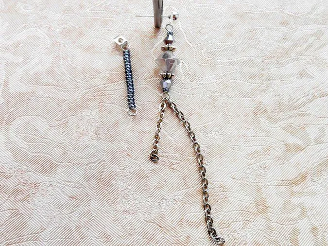 7. Обратите внимание: звенья на переднем и заднем плане соединены цепочками разной длины. Таким же образом делаем вторую серёжку.