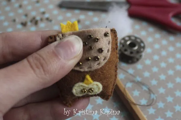 10. Пришивает бусинки-зрачки на глаза и пришиваем клюв с глазами к тельцу.